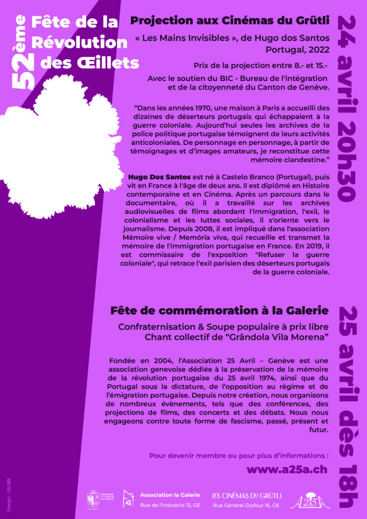 Sessão especial, seguida de um debate com a presença do realizador Hugo Dos Santos. Em colaboração com a Associação 25 de Abril – Genebra.